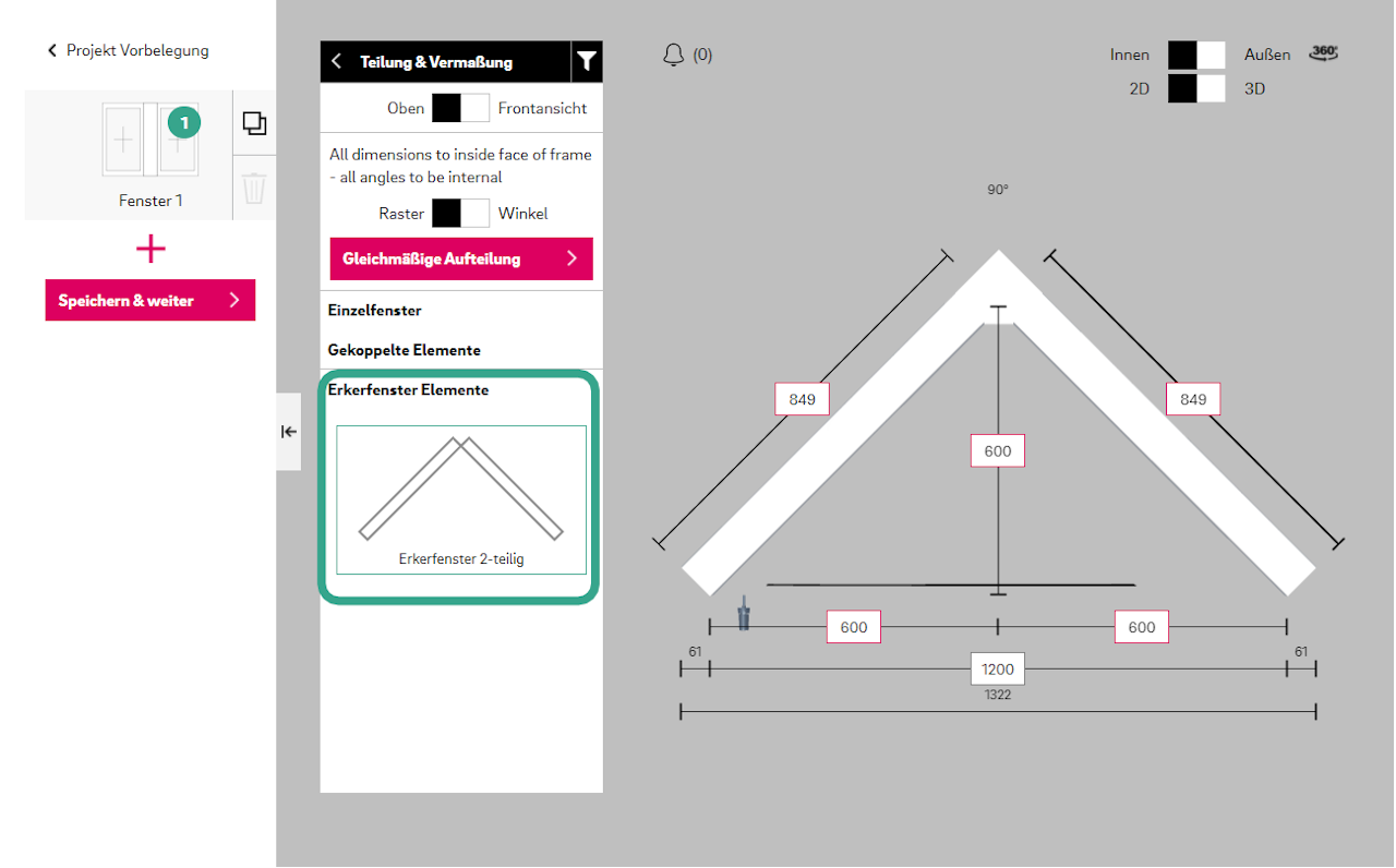 Um ein Erkerfenster zu erstellen, wählen Sie im Abschnitt "Teilung und Vermaßung" in der Kategorie "Erkerfenster Elemente" Ihren bevorzugten Stil.