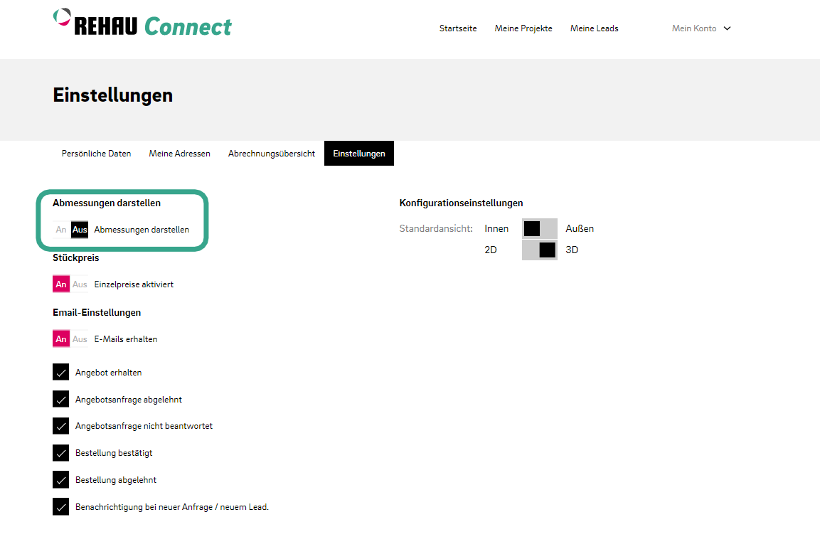 Sie können das Angebot für den Endverbraucher anpassen und somit auch die Abmessungen im Angebot anzeigen oder nicht anzeigen.
