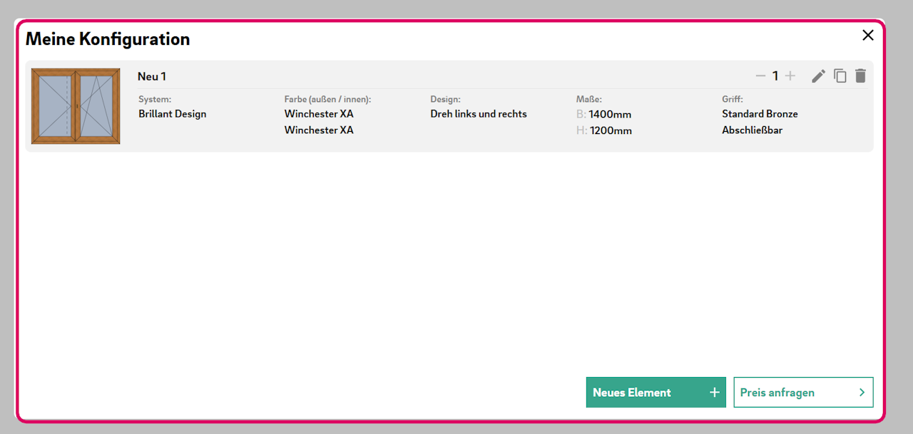 Auf dieser Seite können Sie Änderungen an einem bereits konfigurierten Fenster vornehmen, ein neues Element zum Projekt hinzufügen oder einen Preis für Produkte anfragen.