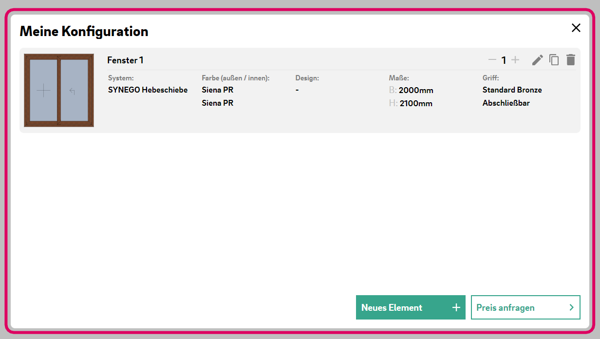Auf dieser Seite können Sie Änderungen an einer bereits konfigurierten Schiebetür vornehmen, ein neues Produkt zum Projekt hinzufügen oder ein Produktangebot anfordern.