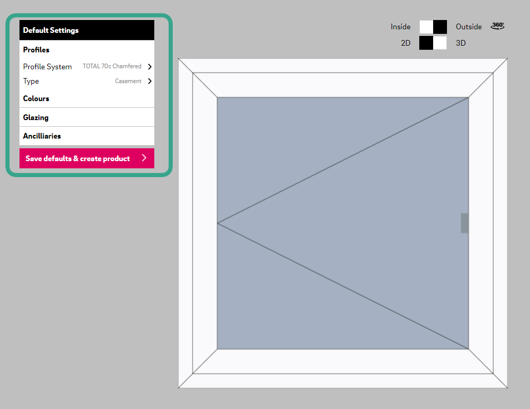 Starting a new configuration you can always set your default settings for the project. In the default settings all important components which are mostly the same for each window in the project can be choosen. You can define e.g. the profile, colours or glazing type.
