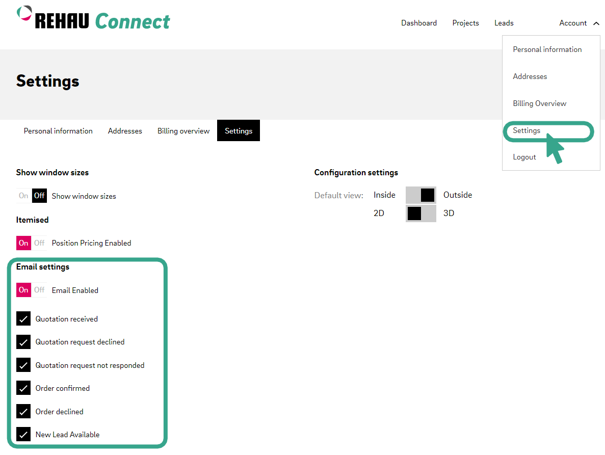 If you do not receive any email e.g. when receiving a new lead or a quotation you may have changed your account settings. Navigate to your account and go to settings and check if all emails are enabled.