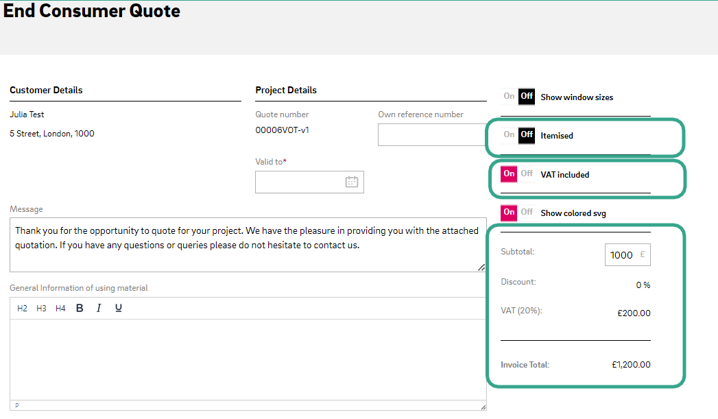 You can decide how you would like to price your project. With the button "Itemised" you can define if you would like to price per window or the total project.
